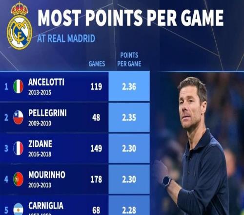 皇马队史执教至少30场主帅场均积分榜:阿隆索2.24分第7