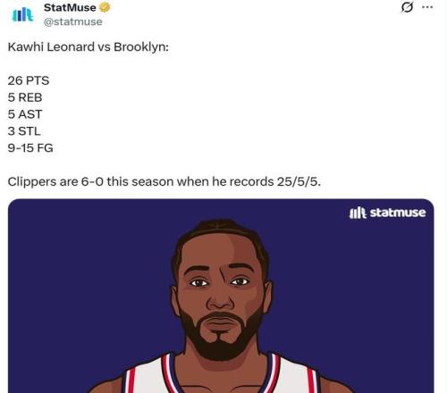 值得一提的是,本场比赛是小卡本赛季第6次单场至少拿到25+5+5数据表现,期间快船队6胜0负保持不败金身。